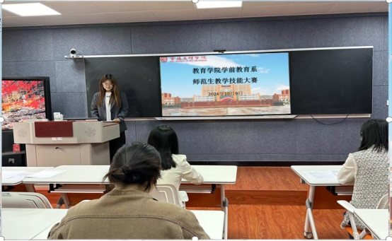 为进一步提升师范生的教学实践能力和创新能力,展示未来教师的风采,学前教育师范生教学技能大赛决赛于10月9日下午在立心楼329和324教室分两组同步举办,共来自2021级、2022级和2023级的12名员工参加了比赛。本次的比赛形式为面试,分为三笔字、教学设计、课件制作、即兴演讲、模拟授课和回答问题五个部分。本次比赛由学前教育系魏园园老师主持,评委有:学前教育系张鹏妮老师、孙彦老师、史文秀老师、王芳老师、高娟老师、张晓宏老师。