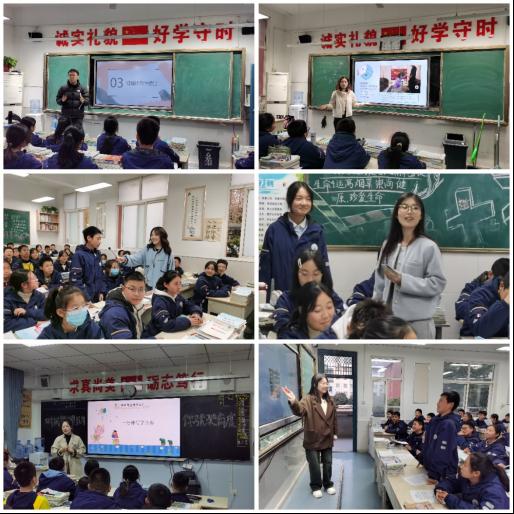 随后,所有参加专业见习的98名同学分为35个小组深入到七年级、八年级的35个班级中,开展心理育人专业实践活动。同学们在试讲和微格教学的训练基础上,在本科生导师的精心指导下,认真准备、自信从容地开展心理健康教育课程讲授和主题班会,内容涉及自我认知、人际交往、情绪管理、压力应对、环境适应、时间管理、职业规划、青春期性心理、安全教育等主题。在同学们的带领下,虢镇初级中学的同学们积极参与、踊跃发言,活动现场充满欢声笑语,在轻松愉悦的课堂氛围中获得压力的释放和心灵的成长。