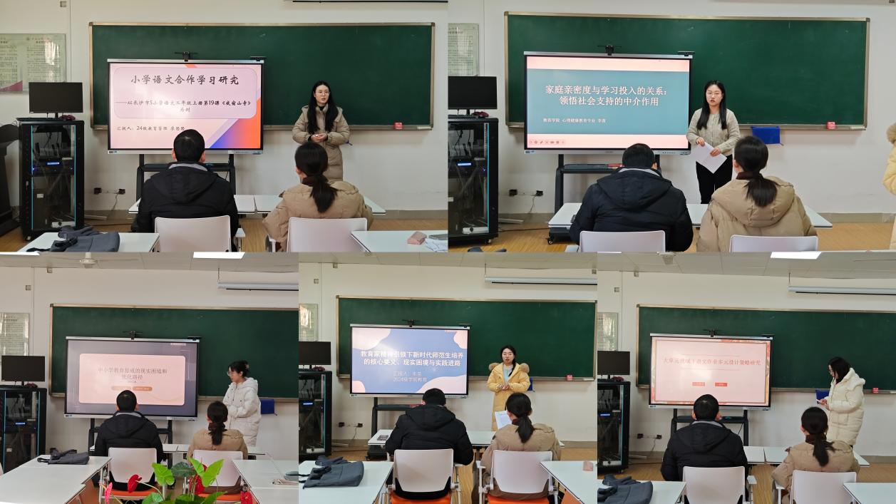 本次论坛由2024级小学教育、教育管理、心理健康教育、学前教育的五位研究生进行汇报。小学教育研究生杜晴以《中小学教育惩戒的现实困境和优化路径》为题,从教育惩戒内涵与类型、中小学教育惩戒的现实困境、优化路径三个方面进行汇报。小学教育研究生周萌以《大单元视域下语文作业多元设计策略研究》为题,从大单元教学理念、大单元视域下语文作业设计原则、当前语文作业设计中存在问题及策略四个方面进行汇报。教育管理研究生廖思思以《小学语文合作学习研究》为题,从合作学习概念界定、小学语文合作学习的必要性、案例分析和解决策略四个方面进行汇报。心理健康教育研究生李茜以《家庭亲密度对学习投入的影响:领悟社会支持的中介作用》为题,从研究背景、相关假设、研究方法与结果、讨论与结论四个方面进行汇报。学前教育研究生朱苗以《教育家精神引领下新时代师范生培养的核心要义、现实困境与实践进路》为题,从核心要义、现实困境、实践路径、参考文献四个方面进行汇报。五位同学的汇报内容丰富,观点鲜明,具有较强的逻辑。