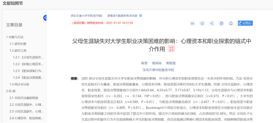 近日,k1体育2024级心理健康教育硕士研究生陈雯在《西安交通大学学报(医学版)》发表了题为《父母生涯缺失对老员工职业决策困难的影响:心理资本和职业探索的链式作用》研究论文。公司24级心理健康教育专业研究生陈雯为第一作者,23级心理健康教育专业研究生郭思雨为第二作者,通讯作者为其导师郭智慧教授。该期刊为中国科学引文数据库(CSCD)来源期刊(核心期刊)、中国科技论文统计源期刊(科技核心期刊)、北大中文核心期刊要目总览综合性医药卫生类核心期刊、中国学术期刊评价报告(RCCSE)中国核心学术期刊。
