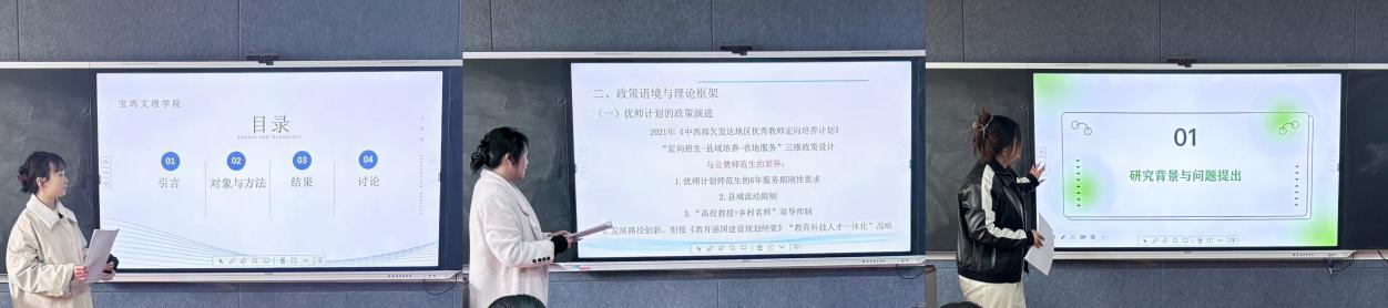 本次论坛由课程与教学论、教育史、教育学原理的三位研究生进行汇报。2024级课程与教学论研究生苏欣瑶以《老员工问题性社交媒体使用与课堂学习有效性的关系:学业倦总的中介作用》为题,从引言、对象与方法、结果与讨论四个方面进行汇报。2024级教育史研究生李沛雨以《新时代乡村教师关怀素养的生成逻辑与培育路径--基于优师计划的价值重构与政策实践》为题,从研究背景、政策语境与理论框架、教师关怀素养价值意蕴的三维解构和教师关怀素养培育策略的系统优化四个方面进行汇报。2024级教育学原理研究生周佳欣以《导生关系”的多维表征、现实困境与改善路径--基于他者伦理学视角》为题,从研究背景与问题提出、多维表征:他者伦理学视域下的批判性审视、改善路径:他者伦理学视角的四维实践指向、结论和参考文献五个方面进行汇报。三位同学的汇报内容丰富,并提出了自己的一些观点与看法。