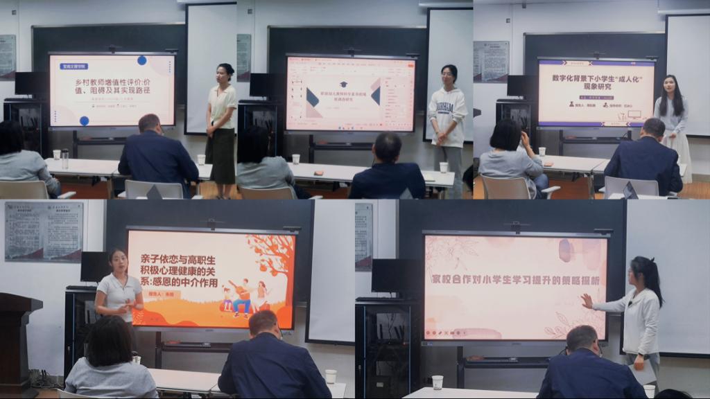 本次论坛由2024级小学教育、教育管理、心理健康教育、学前教育的五位研究生进行汇报。小学教育研究生杨亭玉以《家校合作对小员工学习提升的策略探析》为题,从家校合作的意义、家校合作存在的问题、解决家校合作策略以及总结和反思等四个方面进行汇报。小学教育研究生吴燕子以《乡村教师增值性评价:价值、阻碍及其实现路径》为题,从乡村教师增值性评价的价值、乡村教师增值性评价实施的阻碍和实现路径,等三个方面进行汇报。教育管理研究生周航佩以《数字化背景下小员工“成人化”现象研究》为题,从数字化背景下小员工“成人化”现象与影响、现象形成归因和应对路径,三个方面进行汇报。心理健康教育研究生朱姮以《亲子依恋与高职生积极心理健康的关系:感恩的中介作用》为题,从研究背景、研究内容、研究结果、研究结论和总结与展望,五个方面进行汇报。学前教育研究生宋淅琳以《职前幼儿教师科学素养的现状调查研究》为题,从研究背景与价值、研究设计、现状分析、问题及原因分析、建议策略五个方面进行汇报。五位同学的汇报内容丰富,观点鲜明,具有较强的逻辑。