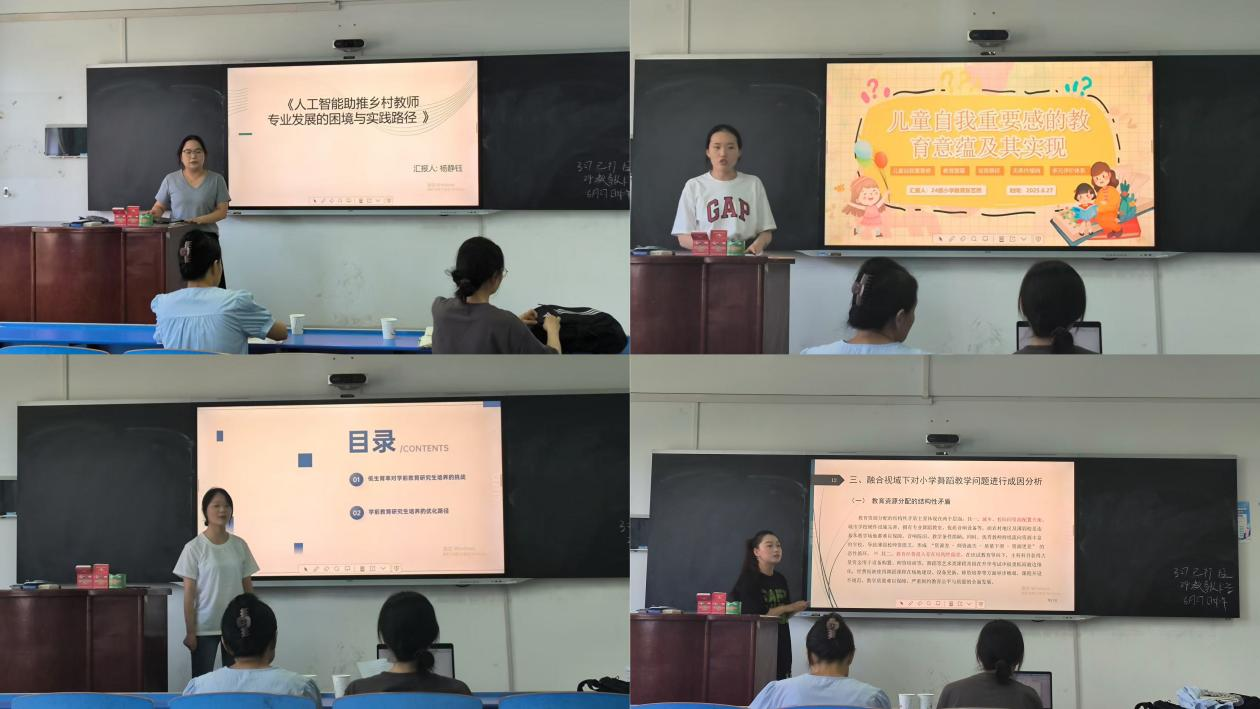 本次论坛由2024级小学教育、学前教育、教育管理的四位研究生进行汇报。小学教育研究生杨钰以《人工智能助推乡村教师专业发展的困境与实践路径》为题作了汇报,主要从研究背景和意义、乡村教师专业发展的困境、实践路径三个方面进行汇报。小学教育研究生张艺然以《儿童自我重要感的教育意蕴及其实现》为题作了汇报,主要从概念内涵与理论基础、儿童自我重要感的教育意蕴、儿童自我重要感培育的现实困境、儿童自我重要感的系统性培育路径四个方面进行汇报。学前教育研究生杜泽兰以《低生育率背景下学前教育研究生专业认同的提升之道》为题作了汇报,主要从低生育率对学前教育公司产品的挑战、学前教育公司产品的优化路径两个方面进行汇报。教育管理研究生张海梅以《融合教学视域下小学舞蹈教学现状探析》为题作了汇报,主要从融合教学概述、当前小学舞蹈教学存在的问题、融合教学视域下对小学舞蹈教学问题进行成因分析、融合教学视域下对小学舞蹈教学问题的策略四个方面进行汇报。四位同学的汇报内容丰富、观点鲜明,具有较强的逻辑。